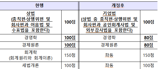 1) 경제학과 경영학의 경우 실무 연관성에 비해 배점이 높았던 문제점이 있었는데 이번 개정안을 통해서 경영학과 경제원론의 배점이 각 100점에서 80점으로 줄어들었습니다.