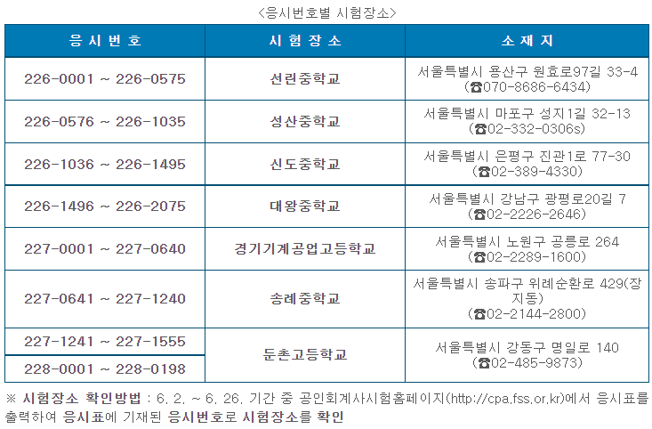 2022년 공인회계사 2차 시험 장소는 아래와 같이 수험번호별로 공고가 되어 있습니다.