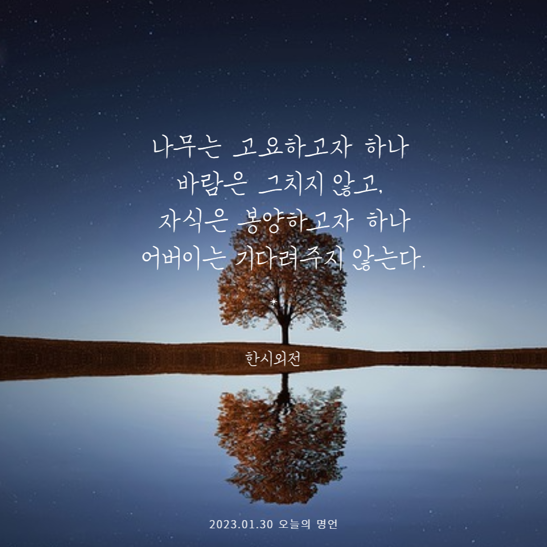 동양 고전들이 지금까지 통하는 걸 보면 옛 선인들의 지혜가 대단해보입니다. 반대로 생각해보면 그만큼 인간들 본성이 바뀌지 않았다는 이야기도 되겠네요. 오늘의 명언은 "나무는 고요하고자 하나 바람은 그치지 않고, 자식은 봉양하고자 하나 어버이는 기다려주지 않는다."는 한시외전의 이야기입니다.