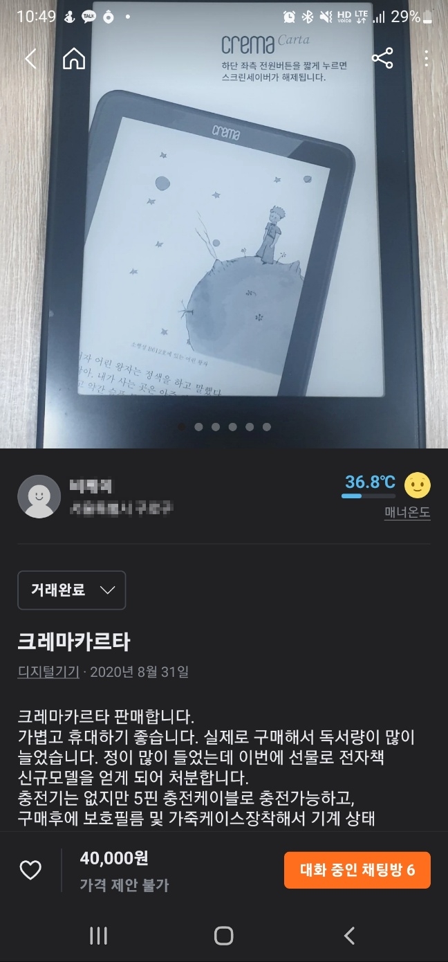 저의 당근 첫 거래는 오랫동안 사용하던 이북리더기를 판매한 것이었습니다. 제가 판매한 이북리더기는 예스24에서 판매하고 있는 크레마카르타 기종이었습니다. 개인적으로 예스24 이외에 리디북스나 밀리의 서재 같은 다른 플랫폼을 활용하고 있었는데, 어느 날부터인가 리디북스에 접속이 안 되었습니다. 안드로이드 버전이 낮아서 그런 거라는 걸 알게 되었고, 새로운 이북리더기를 장만할 결심을 했습니다. 그래서 계획을 세웠습니다. 제게는 사용가치가 없더라도 누군가에게는 필요하겠지 싶어서 처음으로 당근마켓에 제 물건을 올렸습니다.