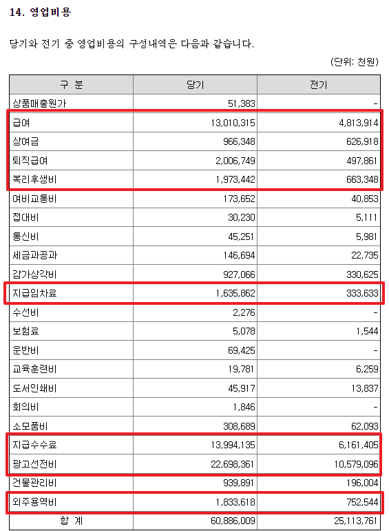 영업비용 주석 내용을 살펴보면 급여, 복리후생비, 지급임차료 등이 3~5배로 증가했습니다. 사세 확장을 하면서 직원들이 많이 충원되었던 것 같습니다. 지급수수료나 광고선전비도 2배 이상 증가했고, 외주용역비도 2배 이상 증가했습니다.
