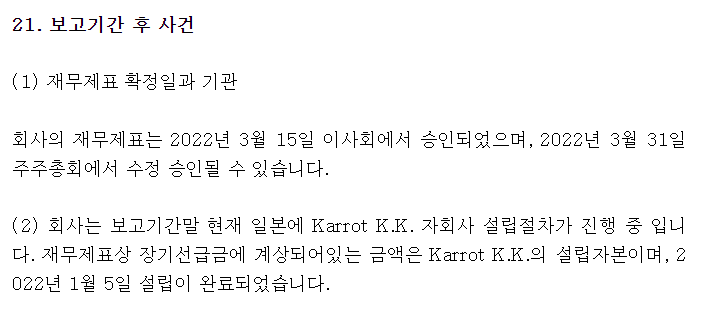 이제 세팅을 완료했으니 2022년에는 이익이 나지 않을까 하는 기대가 드는데, 아직 2022년 감사보고서는 공시되지 않았네요. 2022년 재무제표가 공시되면 바로 확인해봐야겠습니다.