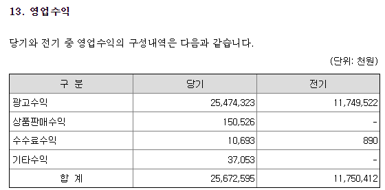 당근마켓의 영업수익은 99%가 광고수익으로 구성되어 있습니다. 2021년 중에 상품판매수익 수수료 수익 등이 발생하기는 했지만 광고수익에 비하면 아주 미미한 수준입니다. 메인인 광고수익은 2020년에서 2021년으로 해를 넘기면서 2배 이상 증가했습니다.