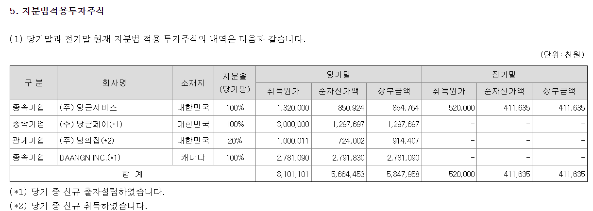 이외에 당근서비스, 당근페이, DAANGN INC의 지분을 100% 취득하여 보유하고 있습니다.