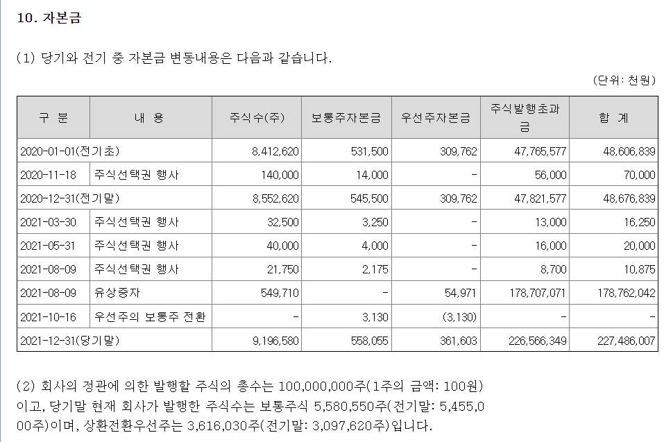 주석 10번 자본금 항목을 보면 자본 변동내역을 상세히 알 수 있습니다.