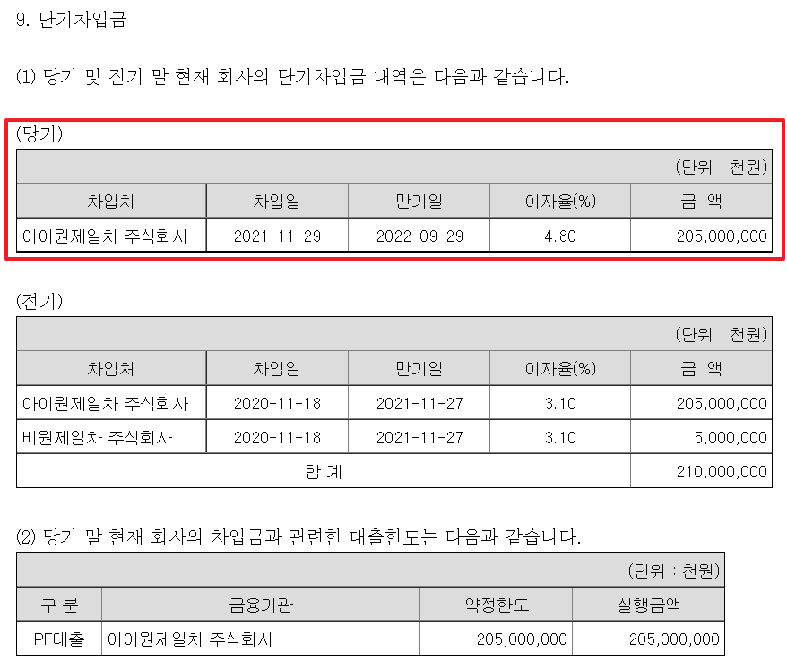 아이원제일차 주식회사에 대한 단기차입금 2050억원의 만기는 2022년 9월 29일, 이자율을 4.8%입니다. 2050억원의 4.8%면 연 이자로만 98억원이 지출됩니다. 어마어마한 금액인데 이게 문제가 되었던 것 같습니다.