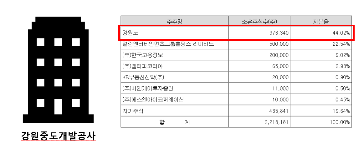 강원도는 레고랜드 사업권을 가진 멀린과 함께 레고랜드 조성 및 운영을 위한 사업 시행 전반과 하중도 전체 부지개발 등의 권한을 가진 "강원중도개발공사"라는 기업을 만듭니다. 그리고 여기에 주주로써 지분을 44% 가지게 됩니다.