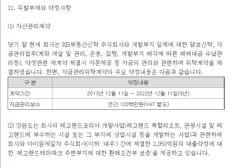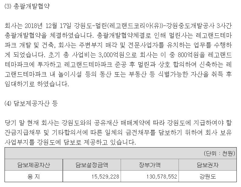 괄호 2번이 핵심인 것 같았습니다. "강원도는 회사의 레고랜드코리아 개발사업과 관련하여 회사와 아이원제일차 주식회사 간에 체결한 2,050억원의 대출약정에 대한 '레고랜드테마파크 주변부지에 대한 환배조건부 보증'을 제공하고 있습니다."