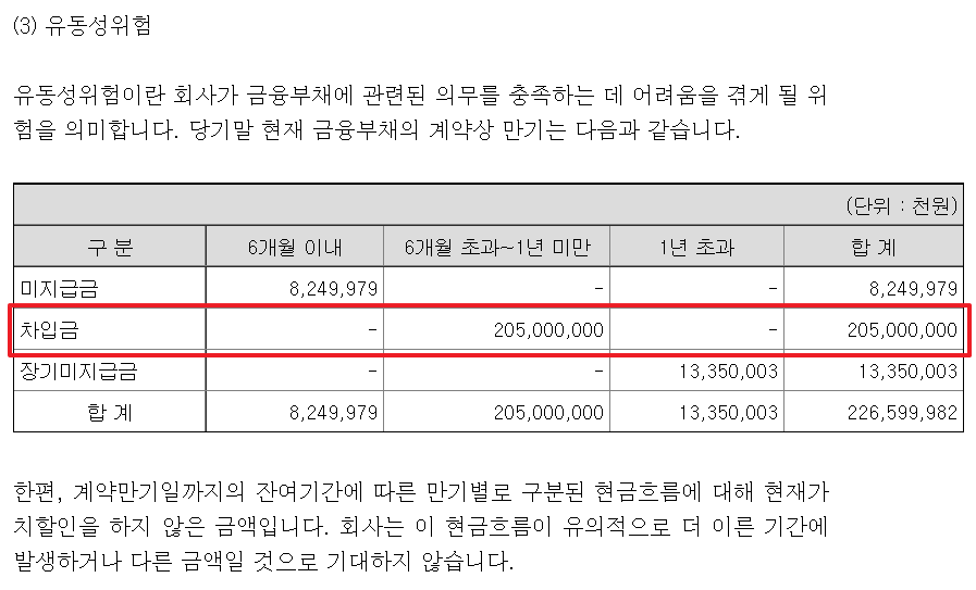 유동성위험 관련 주석내용에서도 차입금 2050억원이 1년 이내 상환예정임을 확인할 수 있었습니다. 조금 더 자세한 사항은 11번 우발부채와 약정사항 주석에 기재되어 있었습니다.