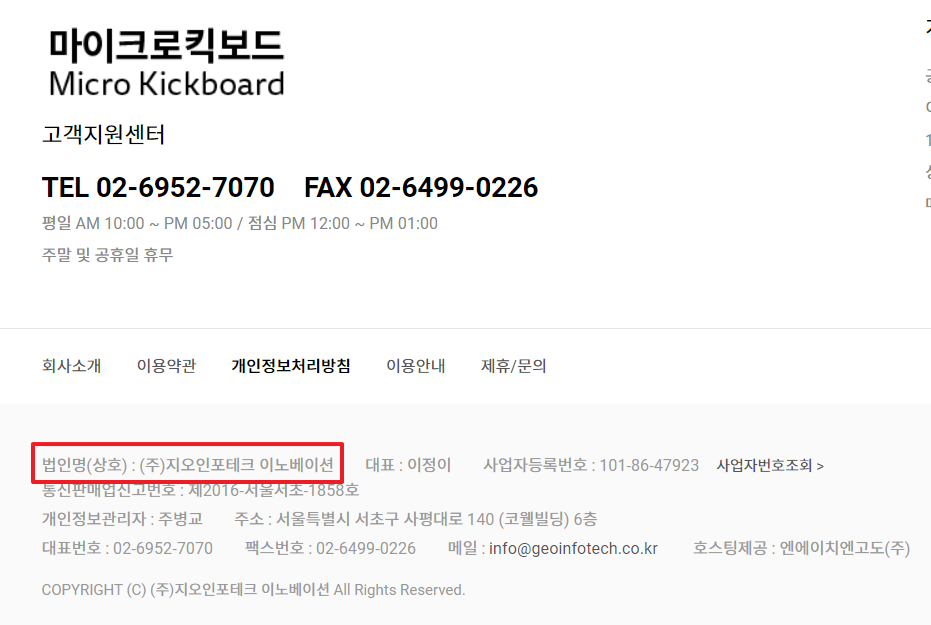 마이크로킥보드 사이트에 들어가서 가장 하단을 보면 법인명이 나옵니다.