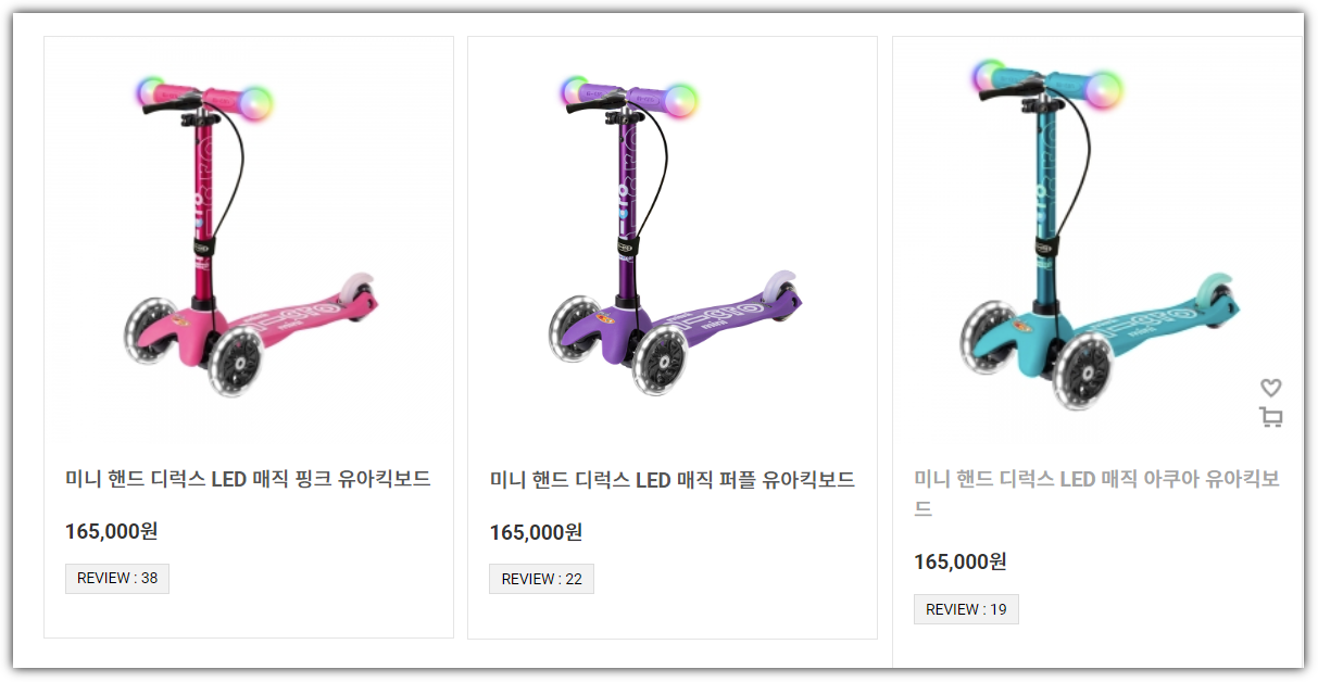 그런데 이 2가지 킥보드가 가격 차이가 많이 납니다. 마이크로킥보드는 유아 킥보드계에서는 "명품(?)"처럼 느껴진다고 해야할까요? 아무큰 엄청 비쌉니다.