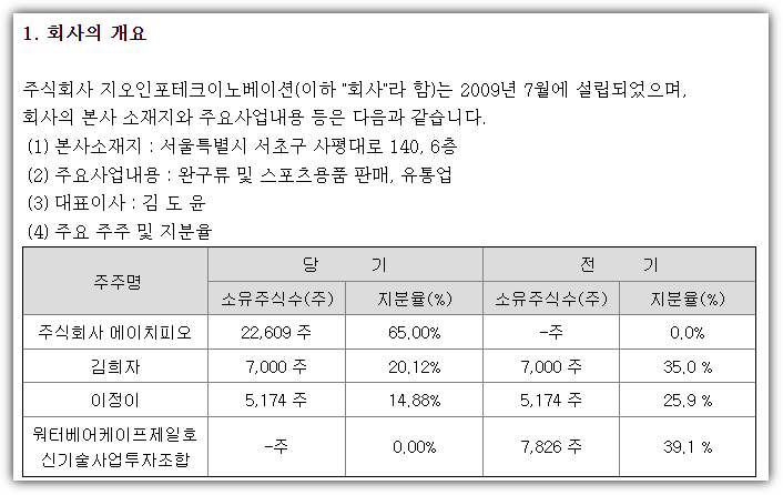 회사 개요 부분을 보니 "주식회사 에이치피오"라는 곳이 21년부터 최대주주가 된 사실을 확인할 수 있었습니다.
