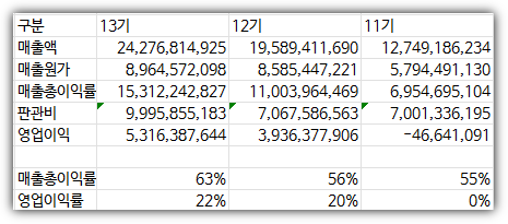 위의 손익분석자료에서 보면 11기에서 20기로 넘어가면서(오른쪽->왼쪽) 매출액이 미친듯이 성장하는 걸 보실 수 있습니다. 매출액이 19년 127억원에서 13기 242억원으로 2년동안 2배 가까이 성장을 했습니다.