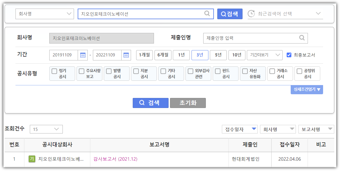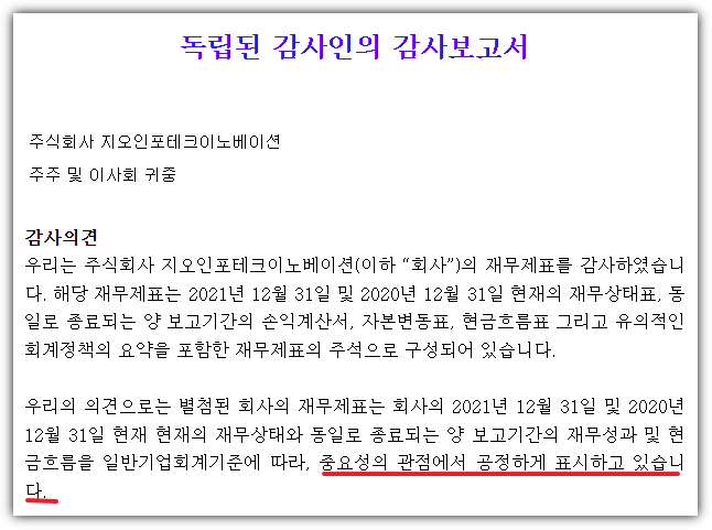전자공시사이트에서 지오인포테크이노베이션 재무제표를 확인했습니다. 다행히 외감법인이라서 2021년도 감사보고서가 검색이 되었습니다.