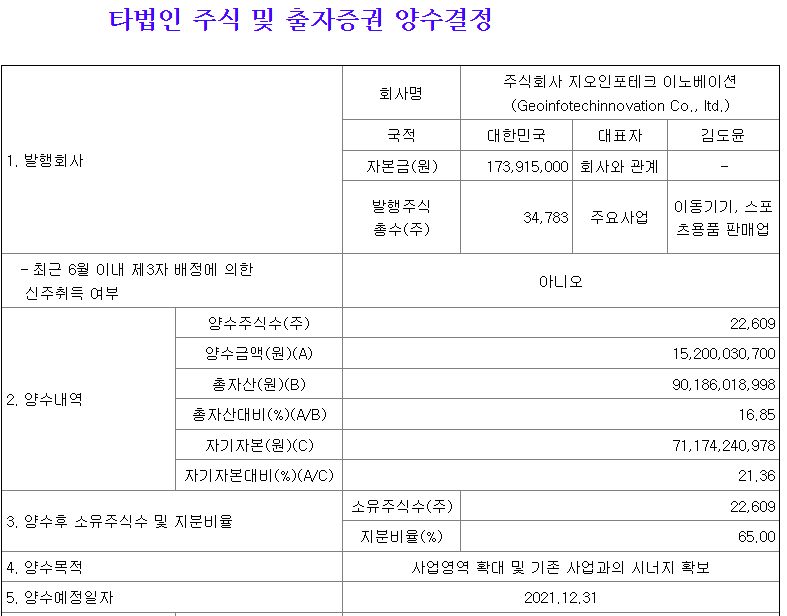 사업영역 확대 및 기존 사업과의 시너지 확보를 목적으로 말이죠. 2021년 12월 31일에 말이에요.