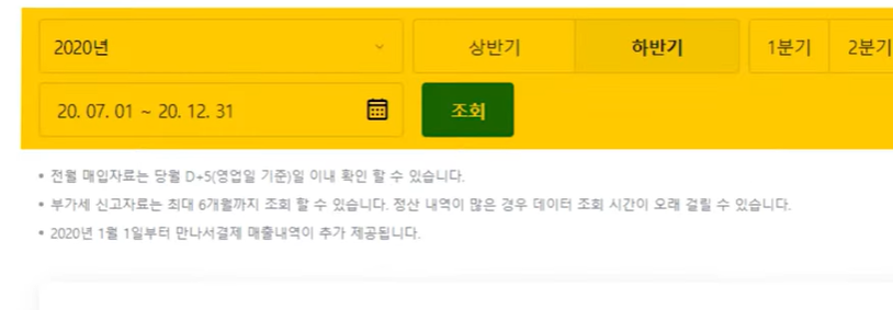 부가세신고내역 메뉴에 들어가면, 기간을 선택할 수 있습니다. 여기서 본인이 원하는 기간을 선택 후 조회를 합니다.