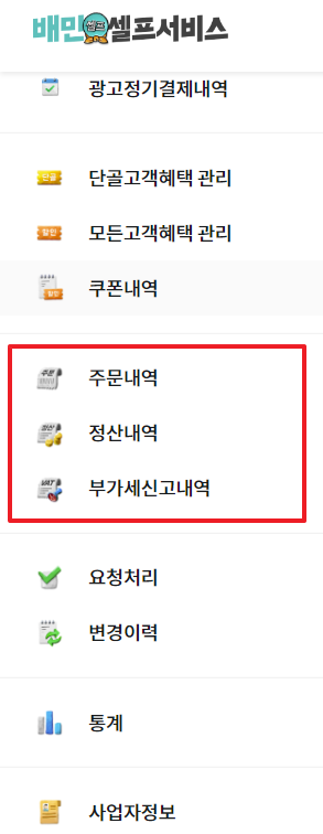 3단계 : 셀프서비스 > 주문정산 > 부가세신고내역 메뉴에 차례대로 들어갑니다.