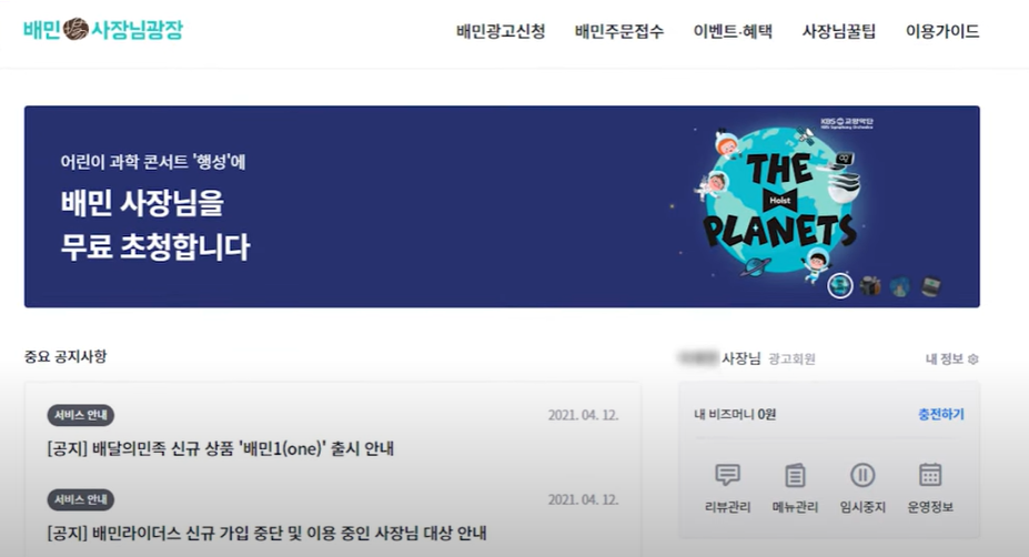 배달의 민족 사장님 광장에 접속하여 로그인합니다. 로그인 하면 아래와 같은 화면이 보이실 겁니다.