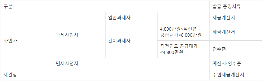면세사업자는 계산서를 발급하고, 신규로 사업을 시작하거나 직전연도 공급대가 합계액이 4,800만원 미만인 간이과세자는 영수증만 발급할 수 있습니다. 한편 세관장은 수입되는 재화에 대하여 수입세금계산서를 수입자에게 발급해야 합니다.