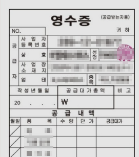 영수증은 공급받는 자와 부가가치세액을 기재하지 않은 계산서를 말합니다. 영수증에는 공급자의 등록번호·상호·성명·공급대가·작성연월일·그 밖의 필요한 사항을 기재해야 합니다. 사업자가 영수증을 발급받은 경우에는 매입세액공제를 받을 수 없고, 거래사실을 입증하는 증표 및 과세자료로 활용하게 됩니다.