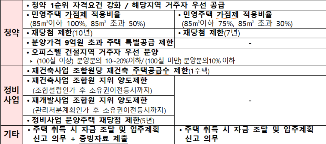 투기과열지구에서는 LTV가 9억원 이하면 40%, 9억원 초과는 20%가 적용되는 등 대출규제가 더욱 강하게 적용되고 재건축과 같은 정비사업의 규제 수위도 높아진다고 합니다.