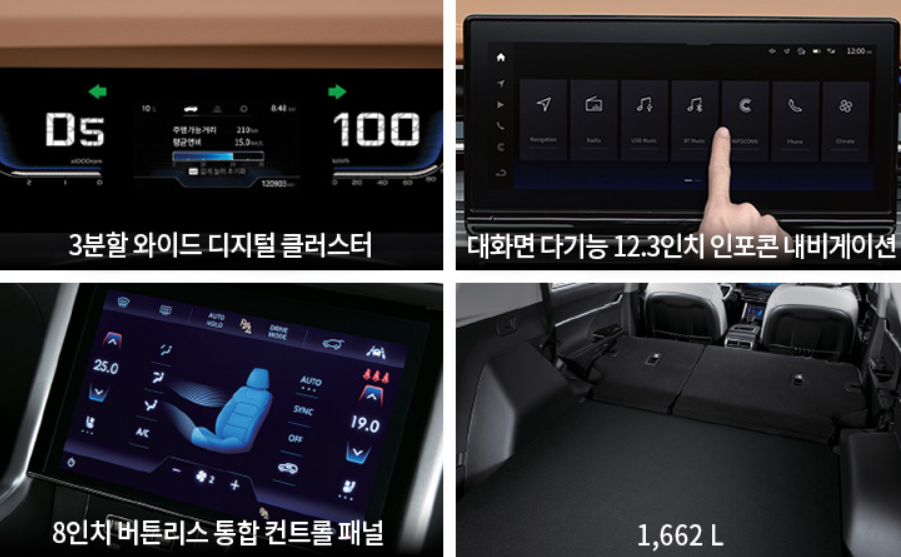 실내는 역동적인 외관에 맞춰 직선형의 운전석 공간을 통해 강인함과 함께 편안함을 느낄 수 있도록 구성했다. 버튼리스 디지털 인터페이스를 적용해 미래지향적이면서 세련된 감성을 느낄 수 있게 했고 3분할 와이드 디지털 클러스터와 12.3인치 다기능 인포콘 AVN, 8인치 버튼리스 디지털 통합 컨트롤 패널 등을 엔트리 모델부터 기본 적용해 주행에 필요한 모든 정보를 제공하고 주요 기능을 사용할 수 있도록 만들었다.