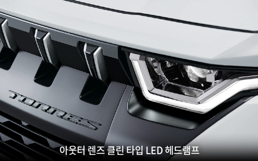 토레스의 외관 디자인은 정통 SUV다운 면모를 자랑한다. 전면부는 짧고 반복적인 세로 격자 모형의 버티컬 타입 라디에이터 그릴과 스키드 플레이트 일체형 범퍼를 적용해 강인한 이미지를 구현했다. 라디에이터 그릴과 이어지는 아우터 렌즈 클린 타입 발광다이오드(LED) 헤드램프는 SUV의 존재감을 뽐낸다. 측면부는 직선형 캐릭터 라인과 측면 상단부의 변화가 조화롭게 어우러져 역동성이 드러나도록 디자인했고 후면부에는 스페어 타이어를 형상화한 핵사곤 타입의 리어 가니시와 리어 LED 콤비네이션 램프를 넣었다.