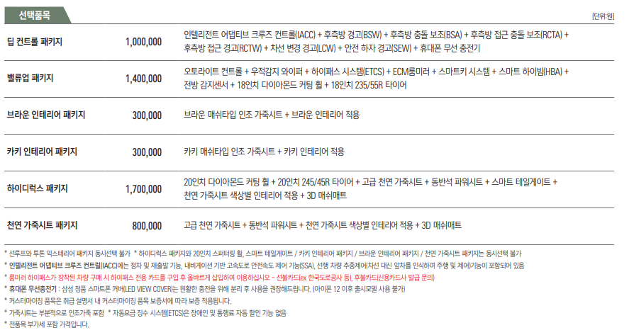 요즘 현기차는 어댑티브크루즈 컨트롤이 대부분 기본 적용인 것 같던데, 아쉽게도 토레스는 선택사항으로 빠져 있네요.