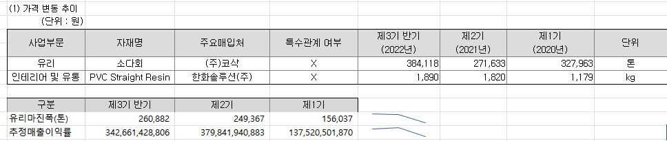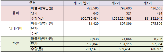 회사 반기보고서의 "사업의 내용" 파트를 참고해서 단가 및 판매량 추세를 분석해 보았습니다. 인테리어의 경우 단가와 수량을 계산하는 단위가 모호해서 따로 분석하지 못했습니다. 회사의 경우 위에서 살펴본 바와 같이 유리사업부의 실적이 중요하므로 저는 유리 사업부에 한해서 분석을 하려고 합니다.