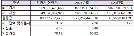 당반기 매출이 증가하면서 매출원가도 증가했습니다. 하지만 재고자산도 전기 1,655억원 수준에서 2,593억원으로 많이 증가한 것을 볼 수 있습니다. 매출채권 분석했을 때와 동일한 논리로 월평균 매출원가를 구해서 재고자산잔액과 비교했습니다. 살펴보면 현재 회사의 재고자산은 총 3개월치를 보유하고 있는 것으로 보이네요. 전기에는 2개월치 재고를 보유했었는데 당반기에는 보유량이 소폭 증가한 것 같습니다. 하지만 2020년말에도 3.22로 계산되는 것을 보면 전기가 재고보유량이 적었던 것이라고 볼 수도 있겠습니다.