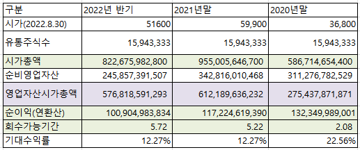 당반기 시가총액은 회사이 유통주식수에 분석당시시점인 2022년 8월 30일 종가를 곱하여 계산했습니다. 이전기의 시간총액은 12월 30일 종가를 적용해서 계산했습니다. 2022년 6월 30일 기준 종가를 곱하는게 일관성 있어 보이지만, 투자하는 시점에서 비교하는게 더 의미가 있을 것 같아 반기의 경우 분석시점 종가를 사용했으니 참고하시기 바랍니다.