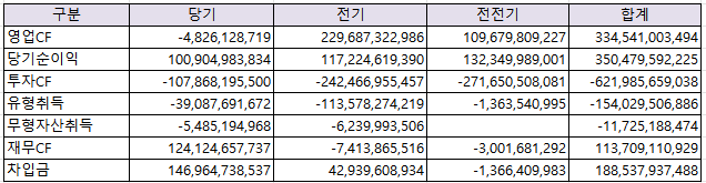 회사의 당반기 현금흐름과 과거 2개년도 현금흐름표를 정리하면 아래 표와 같습니다.