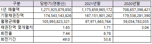 연환산 매출액을 12로 나누면 월평균매출액이 나옵니다. 현재 반기말매출채권금액을 월평균매출액으로 나누면 평균 몇 개월치 매출액이 회수되지 않고 있는지 알 수 있습니다. 당반기 1.65라는 수치를 해석해보자면 회사가 갖고 있는 채권이 최근 1~2개월 발생한 매출로 구성되어 있다는 의미이고 매출액이 매출채권보다 훨씬 큰 상태이기 때문에 부실채권이 발생할 가능성은 낮다고 보시면 됩니다.