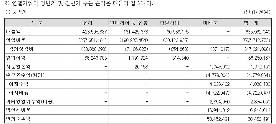 연결검토보고서 주석 32번에서 영업부문손익정보를 볼 수 있습니다. 여기서 보면 유리사업부가 영업이익의 97%를 창출하는 것으로 확인됩니다. 매출액 비중은 60% 정도이지만 영업이익은 대부분 유리사업부에서 발생하는 것을 보면, 회사의 주가도 유리사업부의 실적과 시장환경에 영향을 받는다고 가정하고 분석하면 될 것 같습니다.