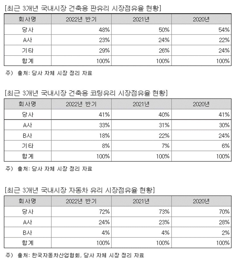 반기사업보고서 상 자체 시장정리자료를 보면 회사의 시장점유율은 매우 높은 것을 확인할 수 있습니다. 국내 자동차유리시장에서는 꾸준히 70%이상의 점유율을 보이고 있고, 국내 건축용 유리 시장에서도 50% 수준을 유지하고 있는 것으로 보입니다.