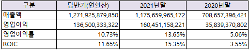 과거기간과 비교 분석을 위해서 반기매출액을 단순 연환산해서 계산하였습니다. 재무제표상 반기매출액에 2를 곱해주시면 위의 표의 값이라는 것을 확인하실 수 있습니다. 영업이익도 마찬가지로 단순연환산했습니다. 표를 보시면 매출액은 2021년 대비해서 늘었으나, 영업이익률은 떨어진 것을 확인할 수 있습니다. 밑에서 자세히 분석하겠지만, 최근 인플레이션으로 인한 원재료 값 상승에 따른 효과인 것으로 추정됩니다.