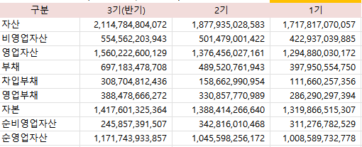3기반기에 영업활동현금흐름이 마이너스이기 때문에 3개년 합친 금액을 기준으로 답하였습니다. 이 말은 회사 영업을 위한 자산을 유지보수하고 재투자하는 비용은 남들 도움없이 커버할 정도로 돈을 잘 벌고 있다는 이야기입니다.