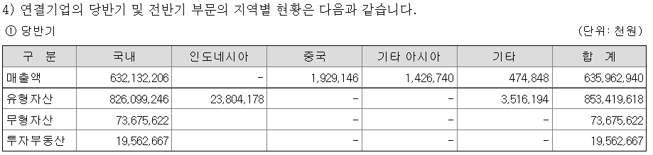 같은 주석에서 지역별 매출액 현황도 확인할 수 있는데요, 회사 매출의 대부분은 국내에서 발생하는 것을 확인할 수 있었습니다. 따라서 위의 사업보고서 상 시장점유율 정보만으로도 충분히 회사의 이익추세를 예측하는데 활용이 가능할 것 같습니다.