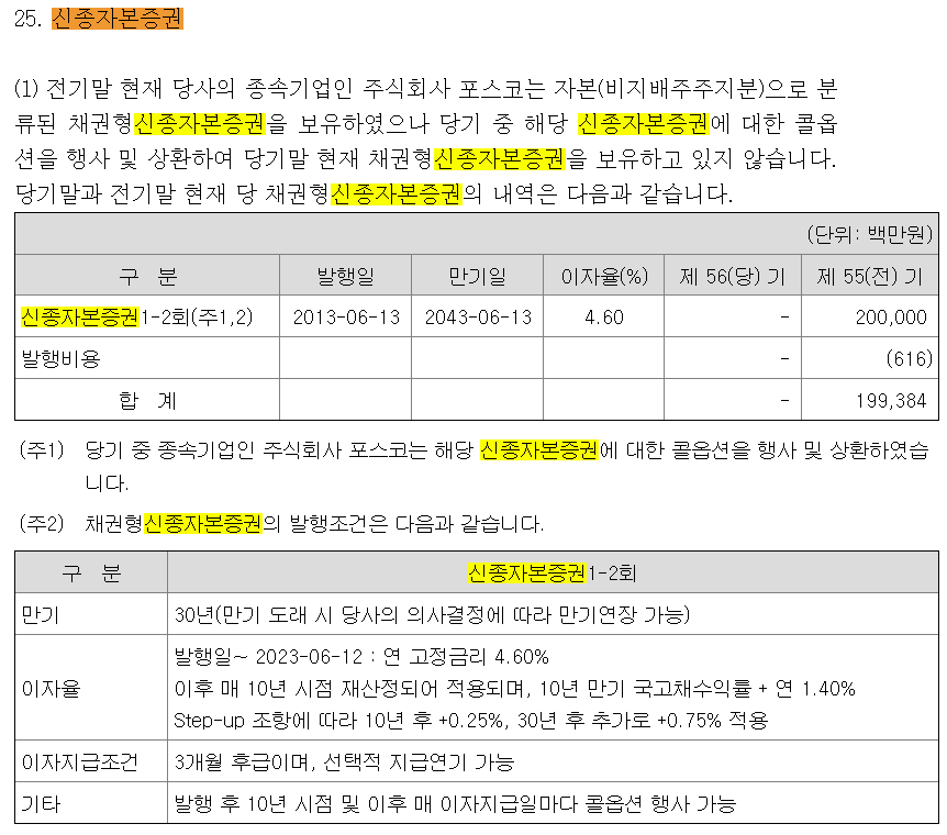 포스코홀딩스 감사보고서도 궁금해서 찾아보니 23년에는 신종자본증권에 대한 콜옵션 행사 및 상환이 이루어진 걸 확인할 수 있었습니다. 채권형신종자본증권의 만기는 30년이고 당사의 의사결정에 다라 만기연장이 가능하다는 문구에서 영구채임을 확인할 수 있었고요.