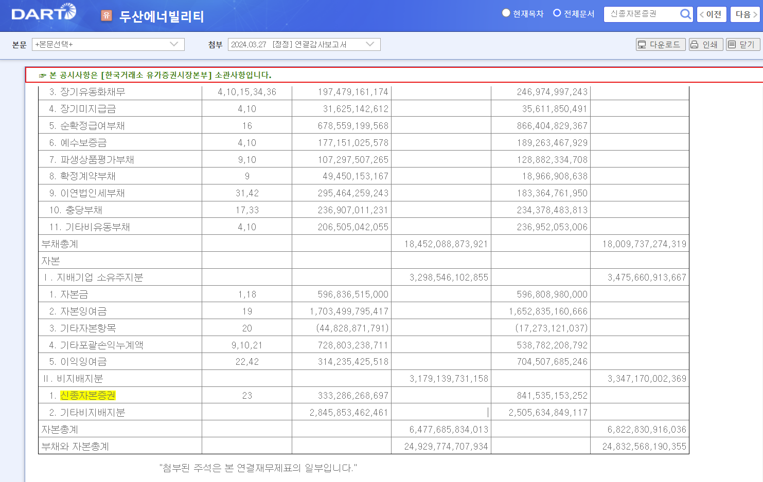 신종자본증권 3332억원이 확인됩니다. 주석 23번을 추가로 살펴보았습니다.