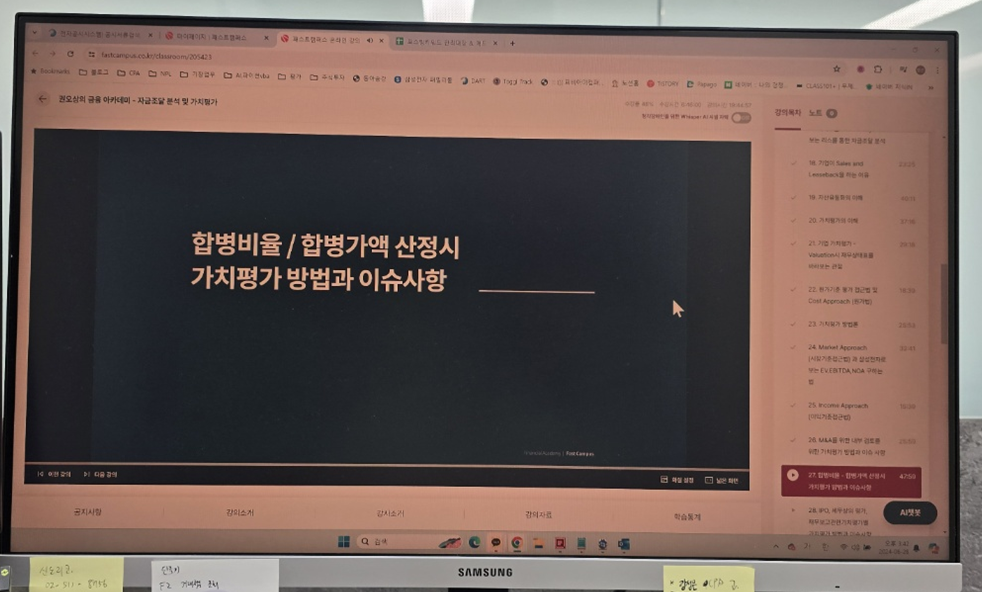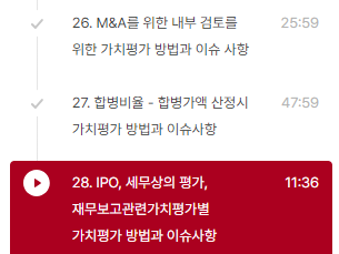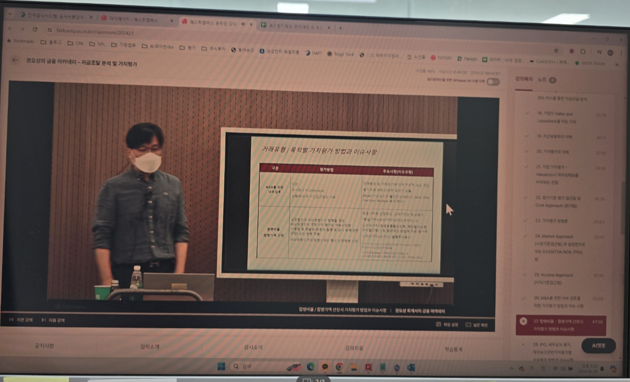 오늘은 거래유형 및 목적에 따른 가치평가방법과 그에 따른 유의사항들이 어떤 것들이 있는지에 대해서 배웠습니다. 실무를 하면서 큰 그림을 보지 못하고 그 때 그 때 케이스별로 일하면서 배우는 경우가 많은데, 사전에 무언가 큰 틀을 정리해주는 강의가 있어서 매우 도움이 많이 되었습니다.