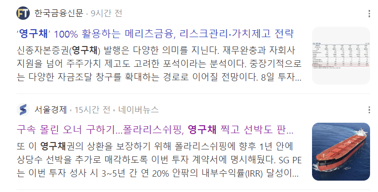 2) 영구채가 최근에도 발행이 되는지 궁금해서 네이버에 "영구채" 관련 기사를 검색해 보았습니다.