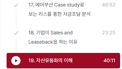 자산유동화의 이해까지해서 자금조달과 관련된 내용 복습을 모두 마쳤습니다.