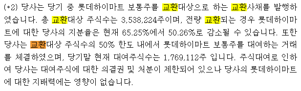 당사는 교환대상주식수의 50% 한도 내에서 롯데하이마트 보통주를 대여하는 거래를 체결하였으며, 당기말 현재 대여주식수는 1,769,112주입니다.