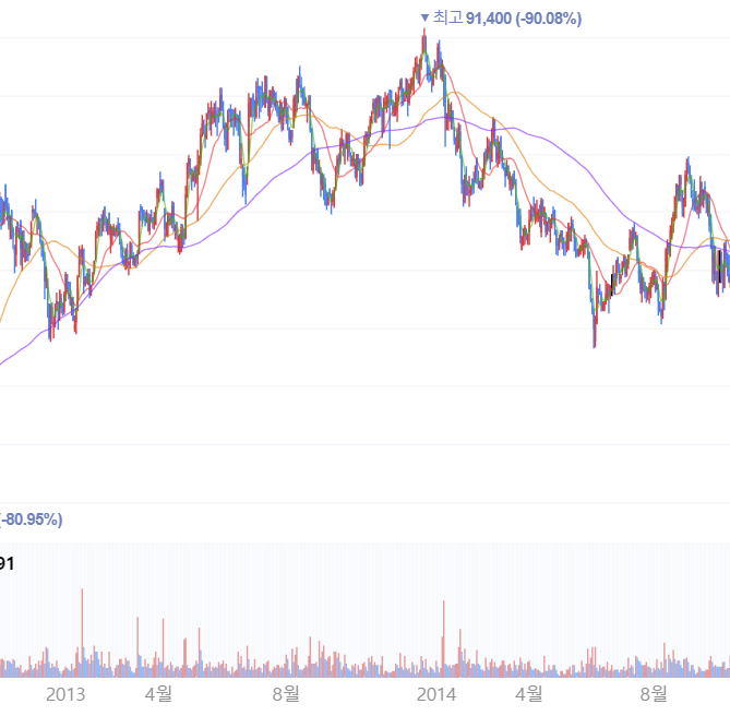 2013년~2014년 롯데하이마트 주가그래프를 찾아보니, 2013년말부터 주가가 폭락한 모습을 확인할 수 있었습니다.