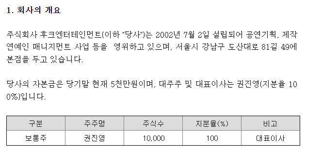 2020년까지는 최대주주가 권진영 대표였습니다. 발행주식 100%를 권진영 개인이 소유하고 있었습니다.