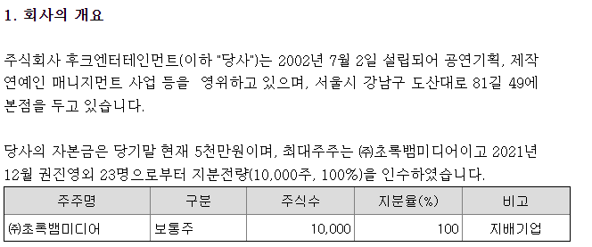 그런데, 2021년 감사보고서에서는 최대주주가 (주)초록뱀미디어로 변경되었습니다. 그것도 100% 지분을 소유한 것으로 확인됩니다. 회사의 2021년 감사보고서 주석1번에는 "최대주주는 (주)초록뱀미디어이고 2021년 12월 권진영 외 23명으로부터 지분전량(10,000주, 100%)를 인수하였습니다."라고 공시하고 있습니다.