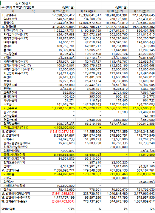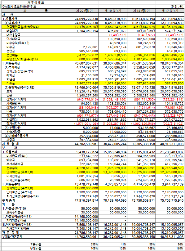전자공시사이트에 공시되어 있는 후크엔터테인먼트의 최근 4개년 재무제표를 확인했습니다.