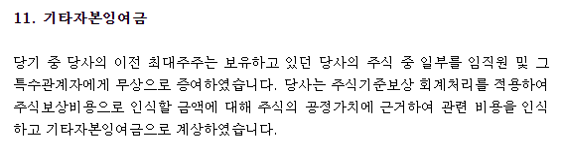 이 거래가 있기 전에 권진영 대표는 자신이 가지고 있던 주식 1만 주 중 3800주를 이선희 이서진, 이승기 등 23명에게 주식을 증여합니다. 해당 증여 건으로 인해서 회사는 주식기준보상 회계처리를 수행함에 따라 주식보상비용 142억원과 동액의 기타자본이 증가한 것입니다. 증여받은 개인들과 권진영 대표는 2021년 12월 9일 그들의 주식을 주당 440만원에 초록뱀미디어에 처분합니다.