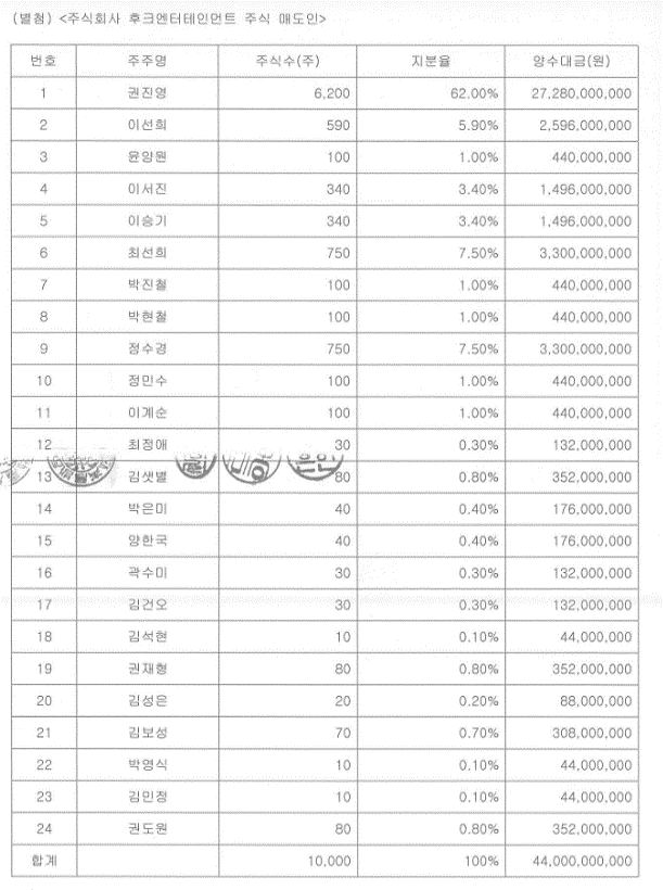 12월 9일 초록뱀미디어에서 권진영 외 23인에게 주당 440만원에 총 10,000주를 440억원에 매수하였으며, 초록뱀미디어가 후크엔터테인먼트를 인수한 목적은 "사업다각화를 통한 기업가치 제고"라고 공시되어 있습니다.